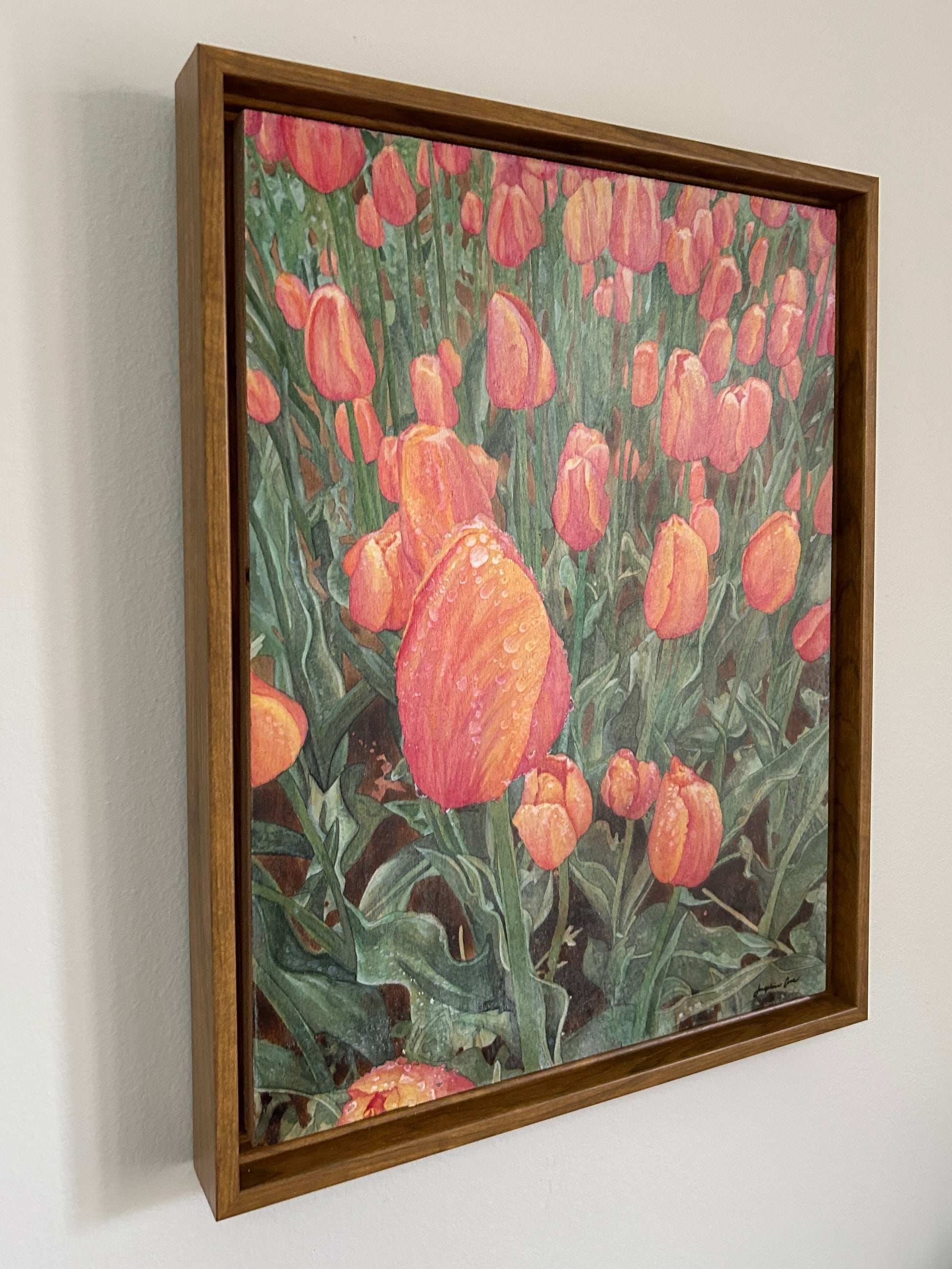 11" x 14" Dew Drop is a pyrography and watercolor painting on wood inspired by the tulip fields at Windmill Island in Holland, MI. The start of spring is marked by these beautiful blooms emerging from the earth as the ground gives way to new life. This piece is carefully burned then painted to capture this moment. The ground is burned to create space for the painted buds and dew drops resting on the petals. As you walk through the tulip fields, you are surrounded by the beauty of nature. It offers a moment to stop and admire each tulip in its unique form.