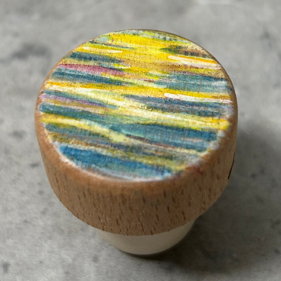 This design is hand painted and wood burned on a wooden wine bottle stopper with a smooth cork base.