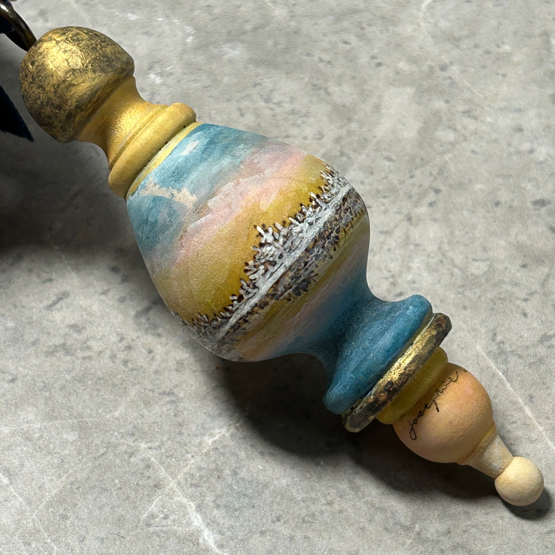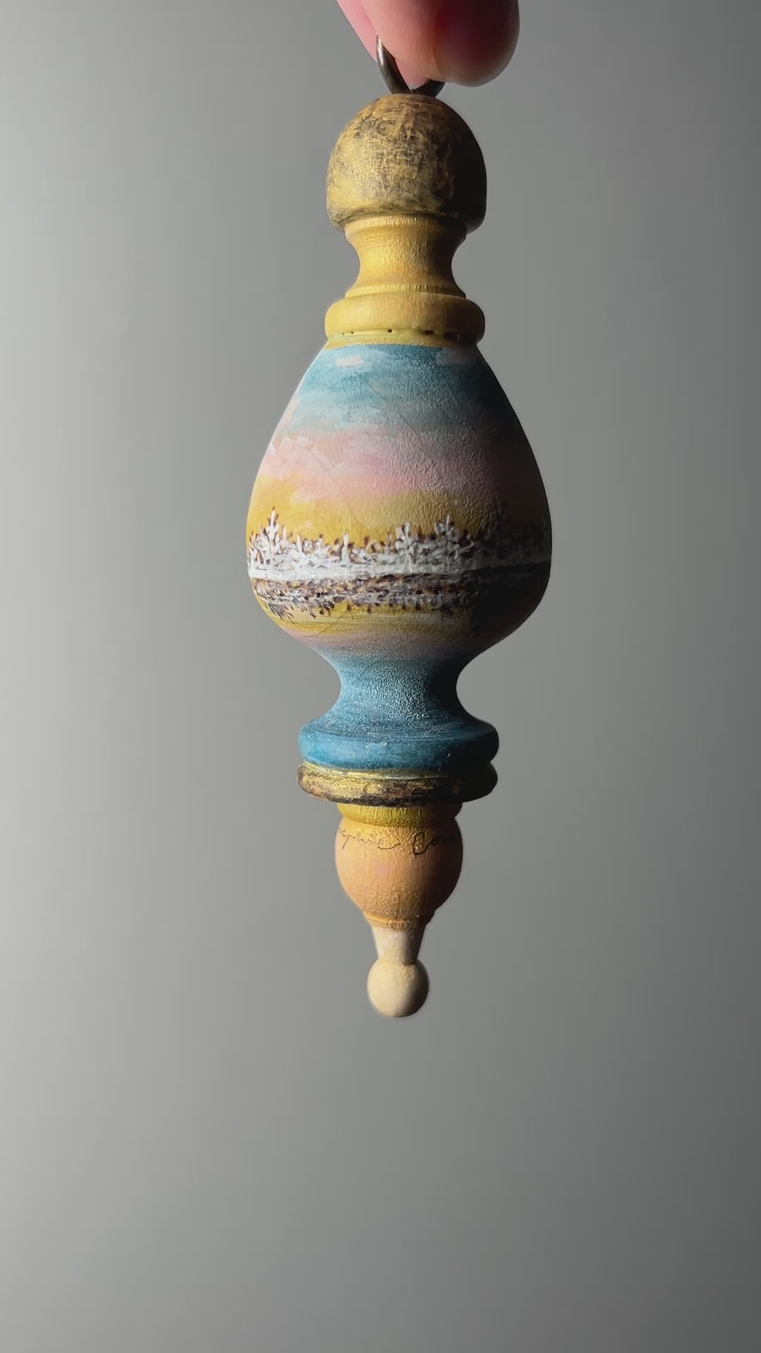 This handmade solid wooden turned ornament is wood burned and painted with the finest details.