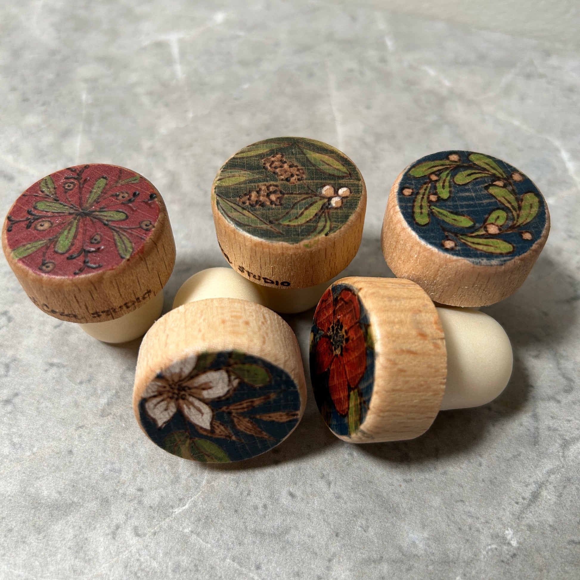 This design is hand painted and wood burned on a wooden wine bottle stopper with a smooth cork base.
