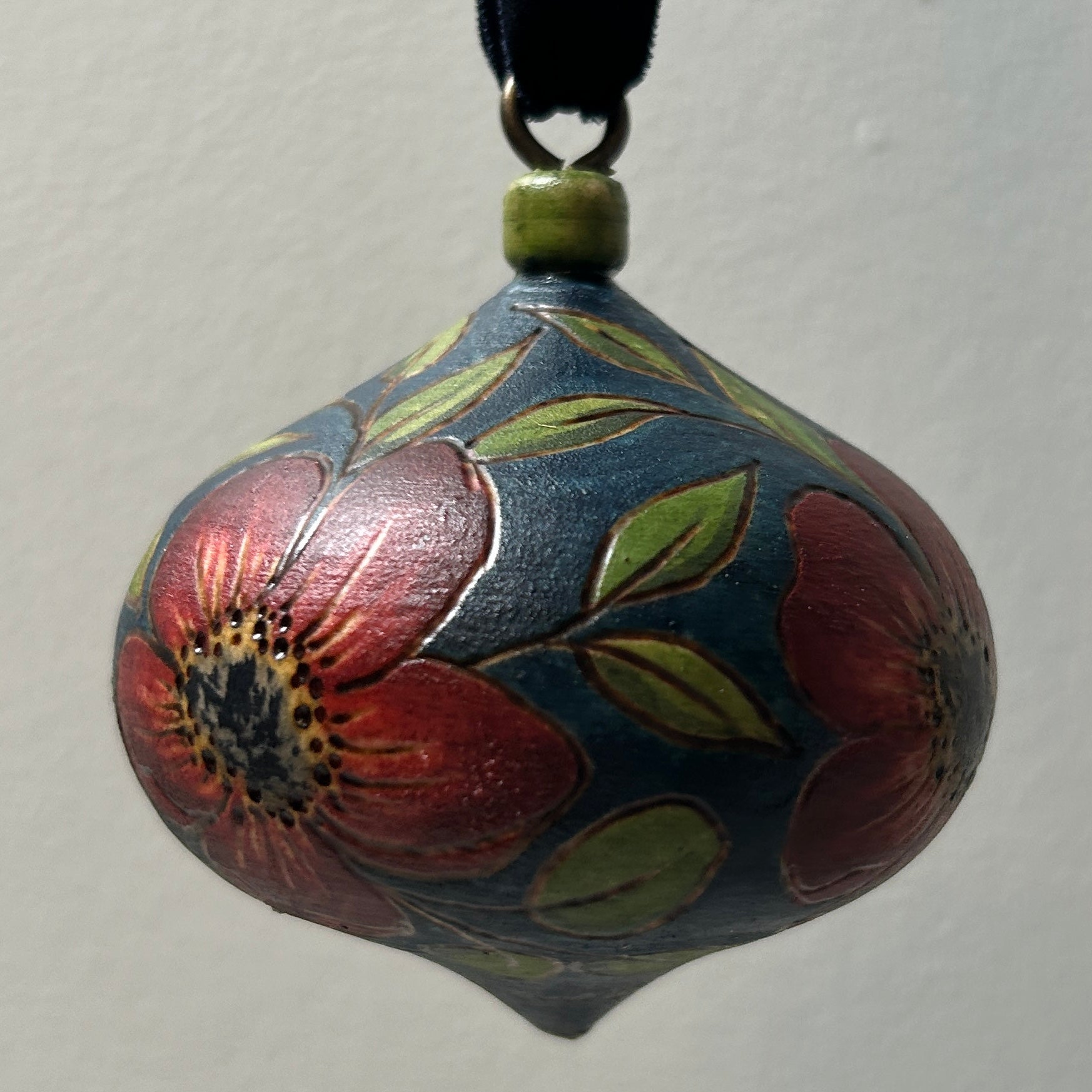 This handmade solid wooden turned ornament is wood burned and painted with the finest details.