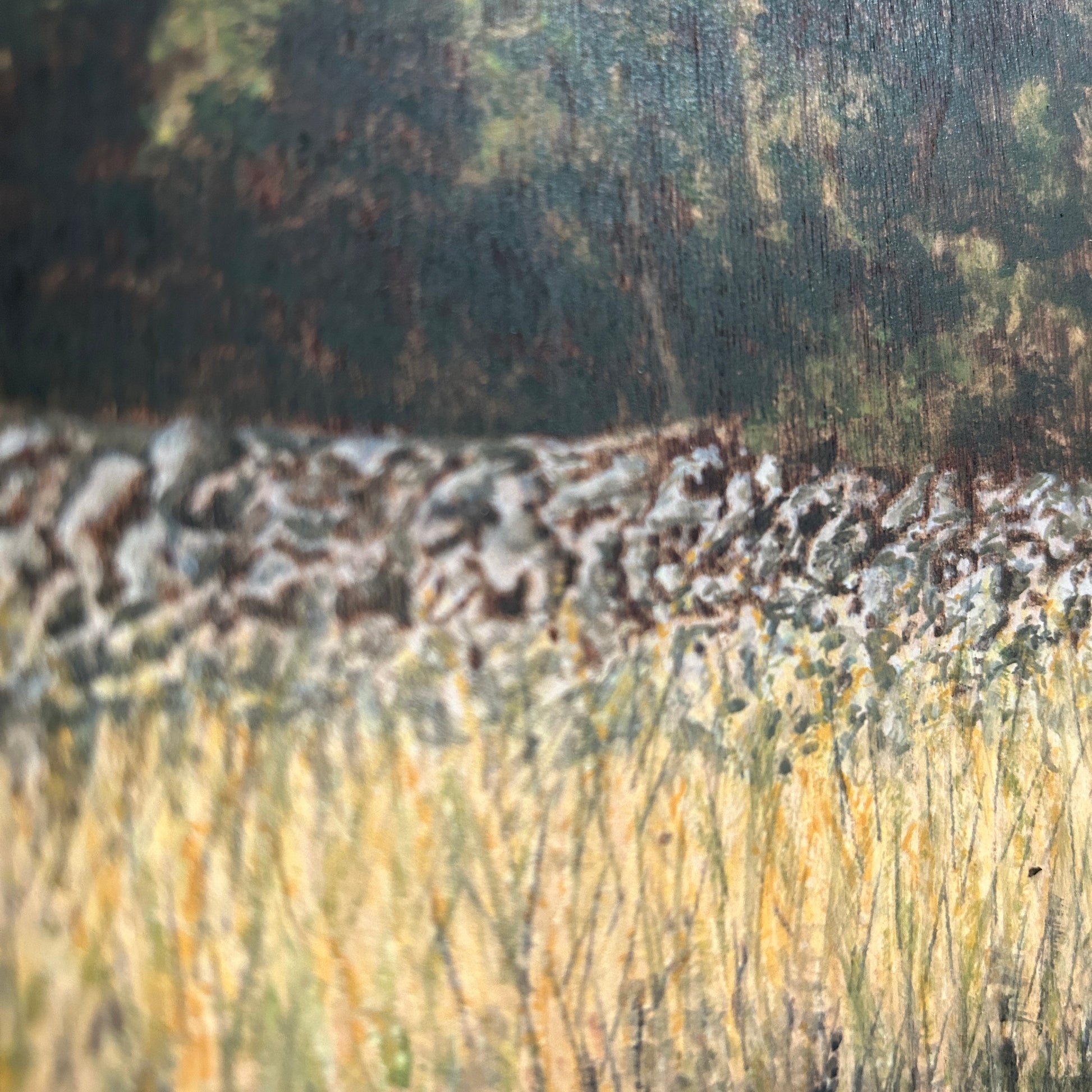 This piece encompasses a variety of natural elements in one composition. The image that was used for reference is from Federal Dam in northern Minnesota. I chose a narrow wood panel to capture the cohesiveness of the piece and draw your eye vertically to each part of the composition. The rocks in the foreground descend into the smooth blue waters of the lake as the trees and reeds reflect on its surface. The white bubbles and foam from the dam add depth to the piece as they float on the surface of the water.
